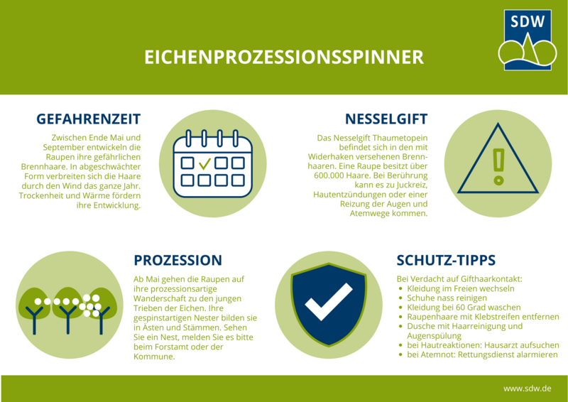 Der Eichenprozessionsspinner ist ein Nachtfalter, der warm-trockenes Klima bevorzugt und sich aufgrund der Klimaveränderungen immer stärker in Deutschland ausbreitet. Die Brennhaare der Raupen sind für Mensch und Tier gefährlich und lösen allergische Reaktionen aus.